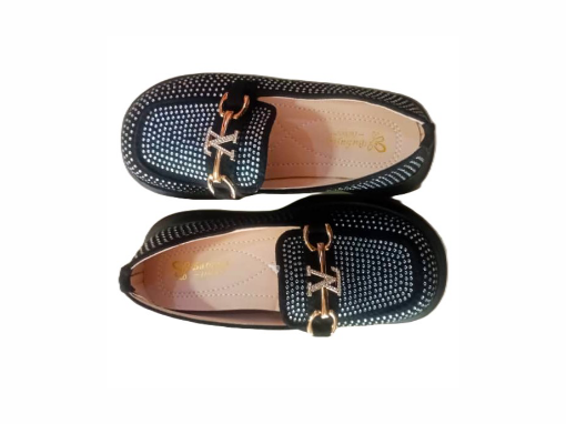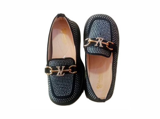 These enchanting black loafers, designed for kids, bring a touch of high-fashion glamour to any young wardrobe. Inspired by Louis Vuitton, they feature an all-over embellishment of shimmering rhinestones, creating a truly eye-catching look. This shoe is perfect for special occasions, parties, or simply making a stylish statement.